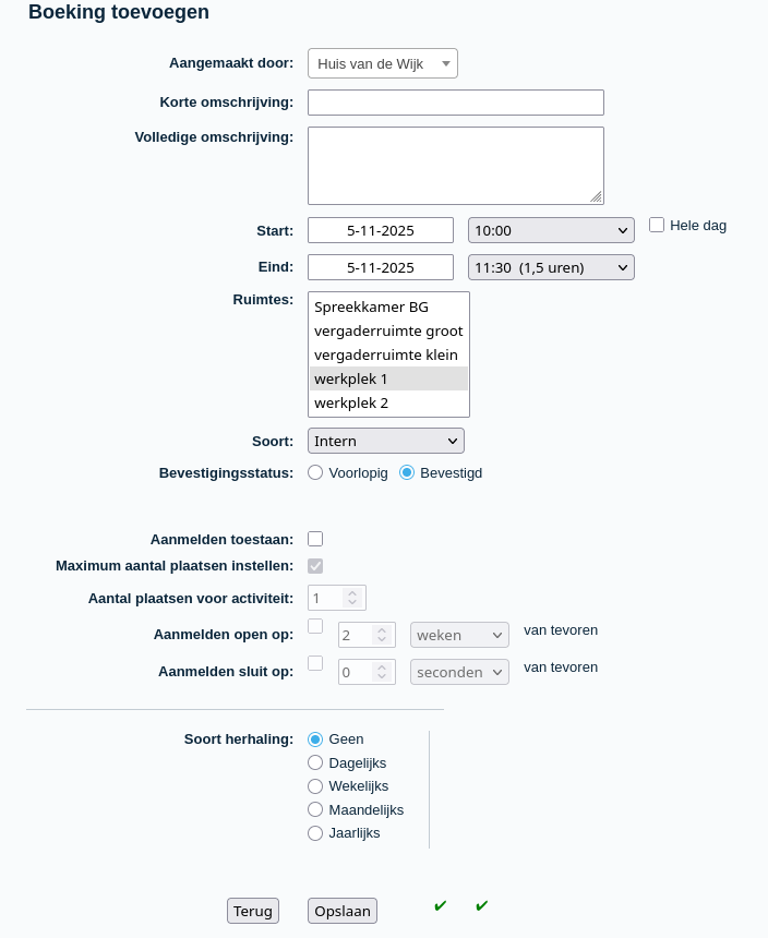 Bij aangemaakt door krijg je je eigen naam te zien. Bij korte omschrijving kan je invullen hoe het in het totaal overzicht moet heten. En de rest spreekt redelijk voor zichzelf. Als alles goed is ingevuld kan je op opslaan drukken. Dan is de meeting opgeslagen.