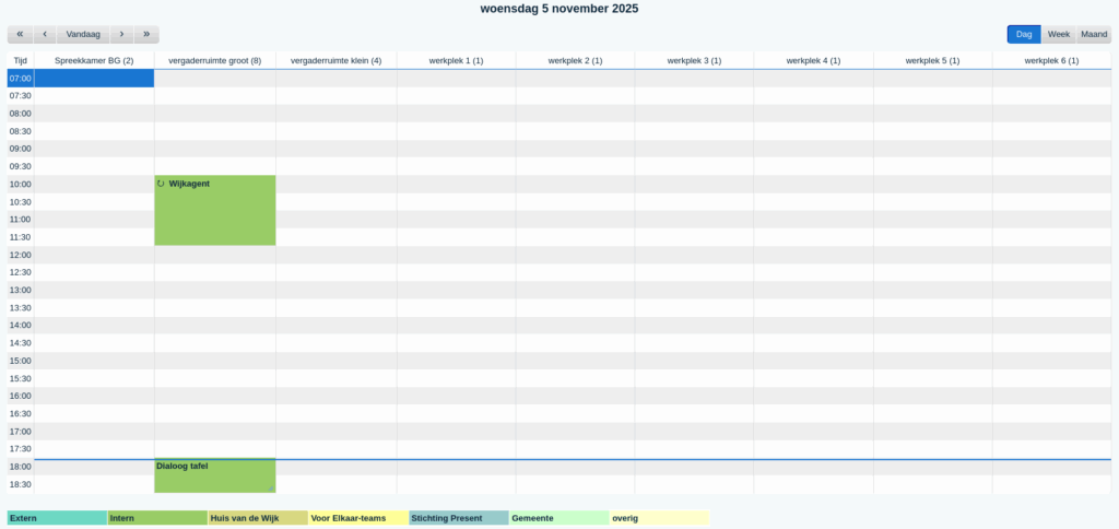 Hierin staan de verschillende werkplekken/vergader ruimtes waaruit geselecteerd kan worden. Tevens zie je of er al plekken zijn gereserveerd door andere.